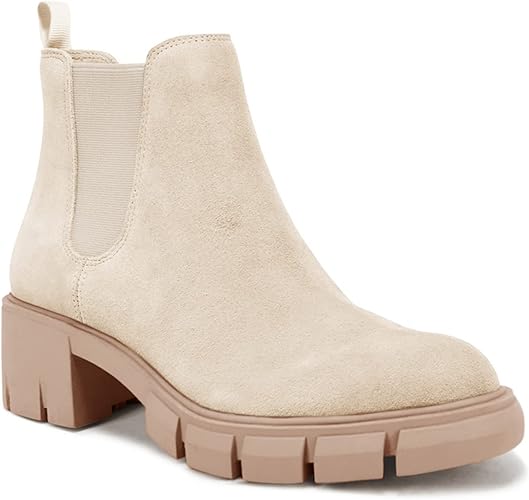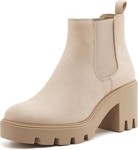 Womens Lug Sole Platform Ankle Booties Chelsea Slip on Chunky Block Heel Leather Combat Boots