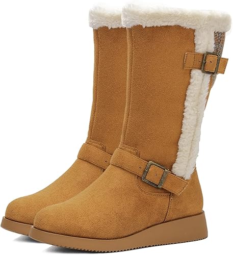 Women's Fashion Mid Calf Snow Boots Low Wedge Heel Winter Booties Faux Fur Cuff Warm Outdoor Shoes