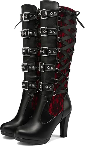 Women Lace Goth Knee High Boots Buckle Block Heel Lace Up Knee Length Boots Punk Platform Tall Boot
