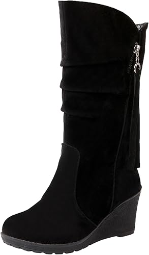 Women Mid Calf Slouch Boot Wedge Heel Thin Fur Lined Suede Leather Winter Shoes