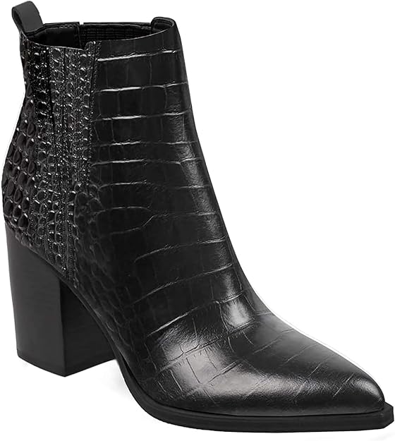 Womens Pointed Toe Slip on Ankle Booties Stacked Mid Block Heel Shoes Faux Leather Boots