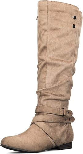 Womens Mid Knee High Boots Chunky Heel Slouchy Metal Buckle Side Zipper Fashion Winter Shoes