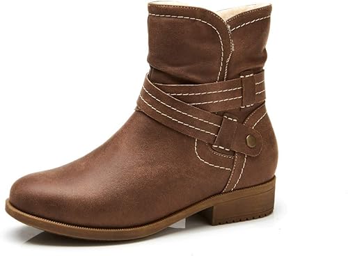 Women's Mid Calf Boots, Fur Lined Round Toe Low heel Cross Straps Slouchy Booties with Zipper